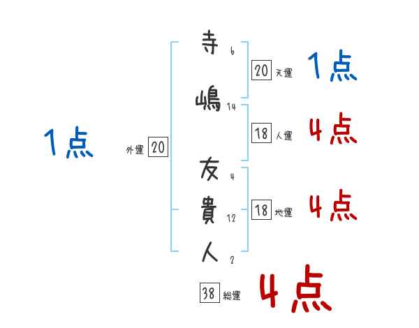 総運![]() | 寺嶋友貴人さんの総運は38画の4つ星!温厚な性格で技術的な才能を発揮する。職人的な仕事に向いている。 あなたの人生を表す1番重要な運勢です。生涯を通じて影響する総合運となり、主に50歳以降の晩年期に影響を及ぼします。 |
