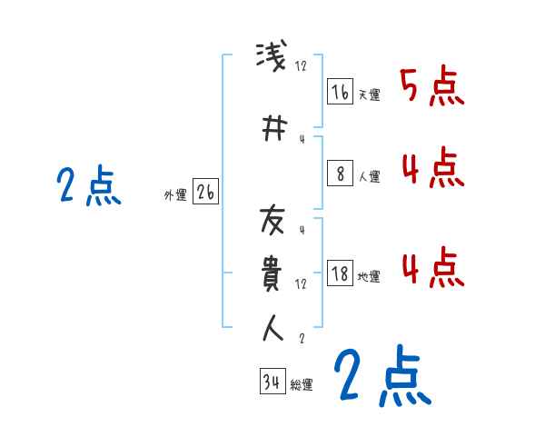 外運![]() | 浅井友貴人さんの外運は26画の2つ星!波瀾万丈かも。信頼できる人を大事にしましょう。 生活面を象徴する運勢です。外部から受ける影響力を表し、結婚運、家庭運や職場、環境への順応性を表します。 |
