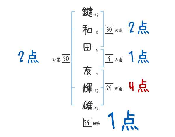 天運![]() | 鍵和田友輝雄さんの天運は30画の2つ星!浮き沈みの激しさに注意しましょう。 家系が持つ宿命的な運勢を表します。祖先から受け継いだ苗字ですので自分の力が及びません。家柄を象徴します。 |