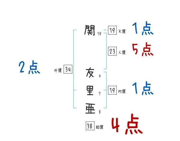 天運![]() | 関友里亜さんの天運は19画の1つ星!優れた才能を持ちますが、協調性が足りないことも。周りの人と協力する事を意識しましょう。 家系が持つ宿命的な運勢を表します。祖先から受け継いだ苗字ですので自分の力が及びません。家柄を象徴します。 |