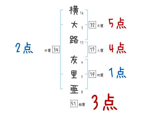 天運![]() | 横大路友里亜さんの天運は32画の5つ星!柔軟性があり成功する。チャンスが多く金運が良い。 家系が持つ宿命的な運勢を表します。祖先から受け継いだ苗字ですので自分の力が及びません。家柄を象徴します。 |
