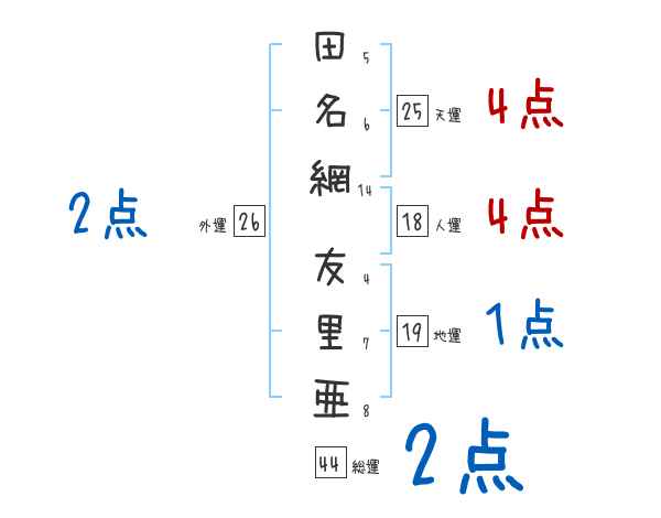 総運![]() | 田名網友里亜さんの総運は44画の2つ星!誠実で慎重な性格。物事を考えすぎないように注意しましょう。 あなたの人生を表す1番重要な運勢です。生涯を通じて影響する総合運となり、主に50歳以降の晩年期に影響を及ぼします。 |