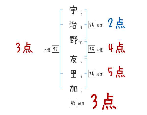 天運![]() | 宇治野友里加さんの天運は26画の2つ星!波瀾万丈かも。信頼できる人を大事にしましょう。 家系が持つ宿命的な運勢を表します。祖先から受け継いだ苗字ですので自分の力が及びません。家柄を象徴します。 |