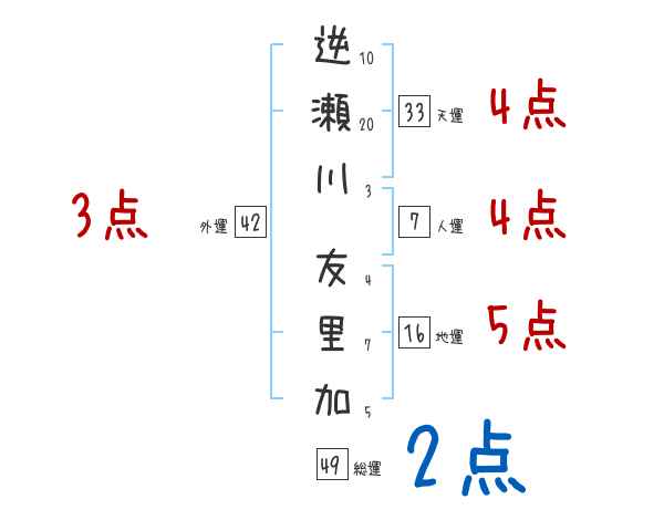 天運![]() | 逆瀬川友里加さんの天運は33画の4つ星!権力志向でプライドが高い。勇気があり運を切り開き成功する。 家系が持つ宿命的な運勢を表します。祖先から受け継いだ苗字ですので自分の力が及びません。家柄を象徴します。 |