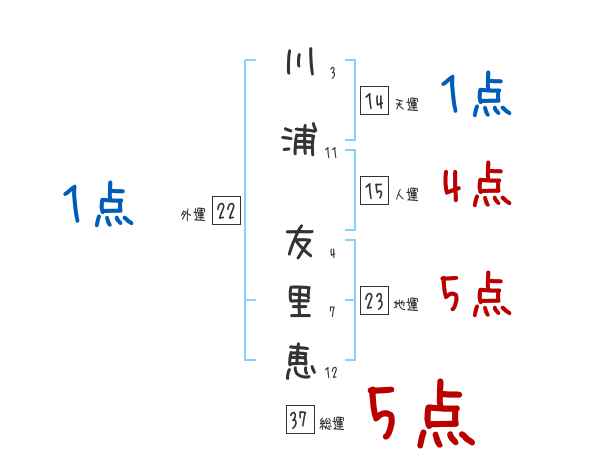 外運![]() | 川浦友里恵さんの外運は22画の1つ星!努力することが苦手ないっぽう手先が器用。芸術性にも優れる。 生活面を象徴する運勢です。外部から受ける影響力を表し、結婚運、家庭運や職場、環境への順応性を表します。 |
