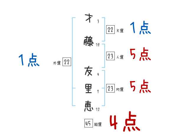外運![]() | 才藤友里恵さんの外運は22画の1つ星!努力することが苦手ないっぽう手先が器用。芸術性にも優れる。 生活面を象徴する運勢です。外部から受ける影響力を表し、結婚運、家庭運や職場、環境への順応性を表します。 |