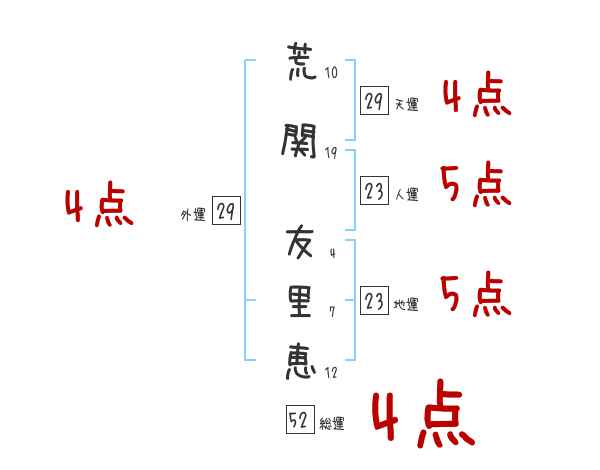 外運![]() | 荒関友里恵さんの外運は29画の4つ星!完全主義で才能がある。厳格な心の持ち主。 生活面を象徴する運勢です。外部から受ける影響力を表し、結婚運、家庭運や職場、環境への順応性を表します。 |