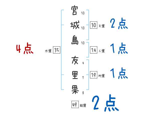 外運![]() | 宮城島友里果さんの外運は35画の4つ星!温厚な性格で感受性が高い。穏和な性格で人望が厚い。 生活面を象徴する運勢です。外部から受ける影響力を表し、結婚運、家庭運や職場、環境への順応性を表します。 |