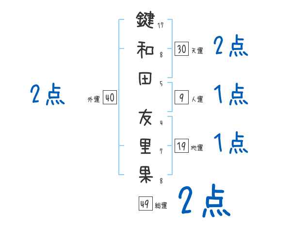 天運![]() | 鍵和田友里果さんの天運は30画の2つ星!浮き沈みの激しさに注意しましょう。 家系が持つ宿命的な運勢を表します。祖先から受け継いだ苗字ですので自分の力が及びません。家柄を象徴します。 |