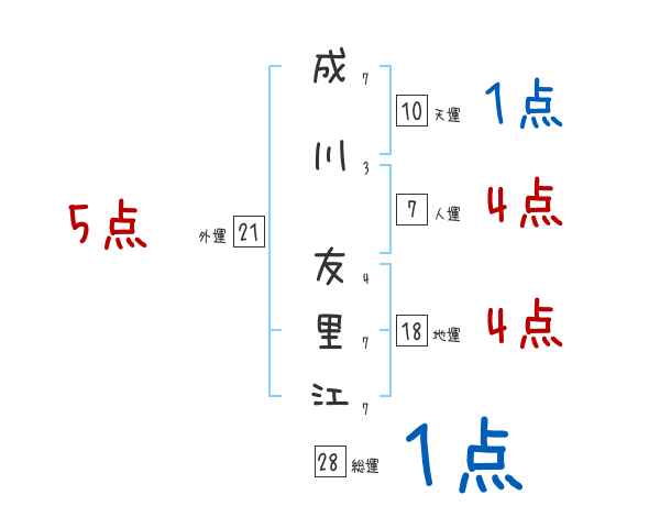| 総運  | 成川友里江さんの総運は28画の1つ星!家庭環境に注意。スポーツで活躍できる能力があるかも。あなたの人生を表す1番重要な運勢です。生涯を通じて影響する総合運となり、主に50歳以降の晩年期に影響を及ぼします。 |