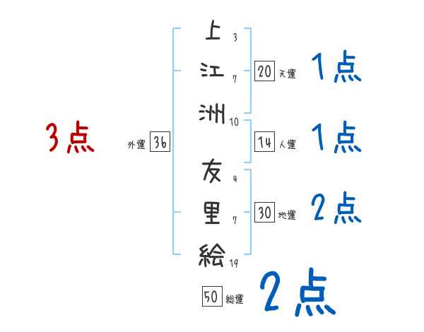 外運![]() | 上江洲友里絵さんの外運は36画の3つ星!先見性が豊かです。多少神経質で苦労することも。 生活面を象徴する運勢です。外部から受ける影響力を表し、結婚運、家庭運や職場、環境への順応性を表します。 |