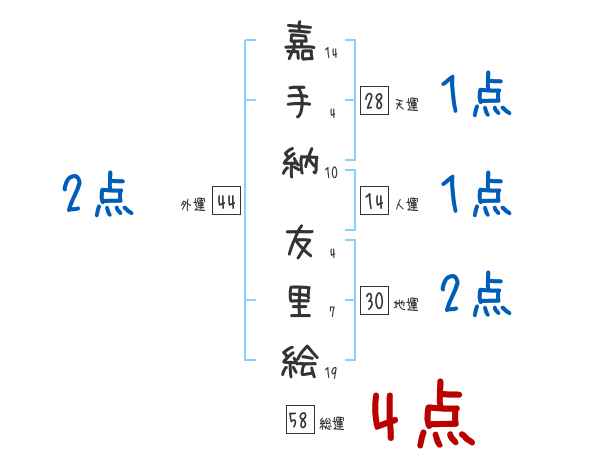 総運![]() | 嘉手納友里絵さんの総運は58画の4つ星!安定した生活。大器晩成タイプ。 あなたの人生を表す1番重要な運勢です。生涯を通じて影響する総合運となり、主に50歳以降の晩年期に影響を及ぼします。 |