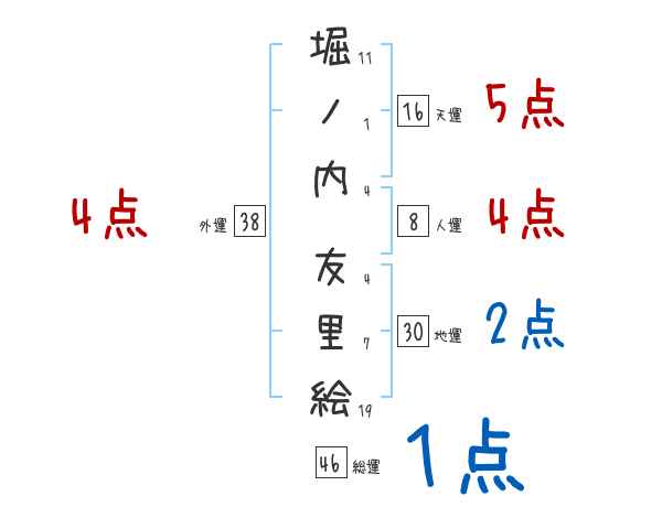 天運![]() | 堀ノ内友里絵さんの天運は16画の5つ星!人望が厚く大きく発展する。逆転成功が見える。 家系が持つ宿命的な運勢を表します。祖先から受け継いだ苗字ですので自分の力が及びません。家柄を象徴します。 |