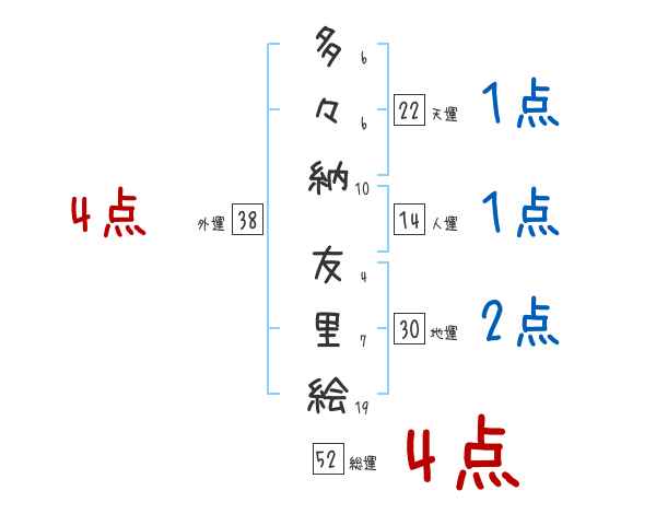総運![]() | 多々納友里絵さんの総運は52画の4つ星!先見性と独創性に優れ考える力がある。強運の持ち主。 あなたの人生を表す1番重要な運勢です。生涯を通じて影響する総合運となり、主に50歳以降の晩年期に影響を及ぼします。 |