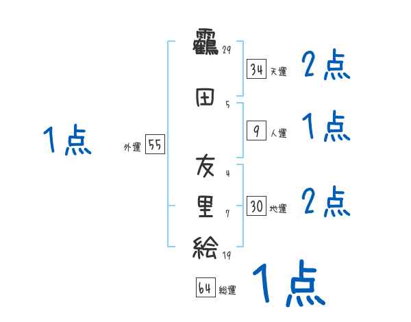 天運![]() | 靏田友里絵さんの天運は34画の2つ星!独創性に優れるが、自尊心が強く災難に注意しましょう。 家系が持つ宿命的な運勢を表します。祖先から受け継いだ苗字ですので自分の力が及びません。家柄を象徴します。 |