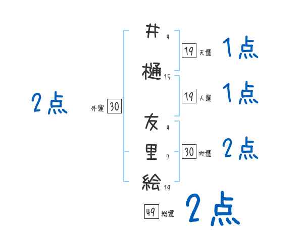 外運![]() | 井樋友里絵さんの外運は30画の2つ星!浮き沈みの激しさに注意しましょう。 生活面を象徴する運勢です。外部から受ける影響力を表し、結婚運、家庭運や職場、環境への順応性を表します。 |