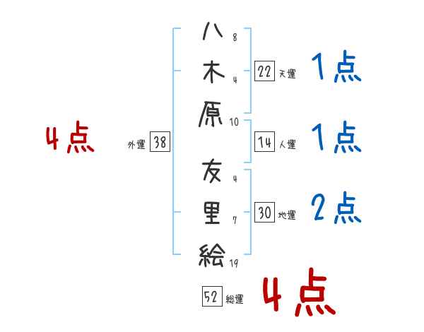 外運![]() | 八木原友里絵さんの外運は38画の4つ星!温厚な性格で技術的な才能を発揮する。職人的な仕事に向いている。 生活面を象徴する運勢です。外部から受ける影響力を表し、結婚運、家庭運や職場、環境への順応性を表します。 |