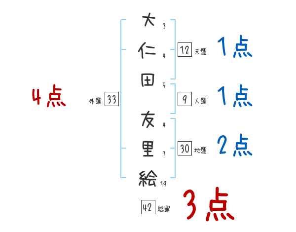天運![]() | 大仁田友里絵さんの天運は12画の1つ星!簡単な失敗で諦めてしまいやすいかも。着実に行動すると良いでしょう。 家系が持つ宿命的な運勢を表します。祖先から受け継いだ苗字ですので自分の力が及びません。家柄を象徴します。 |