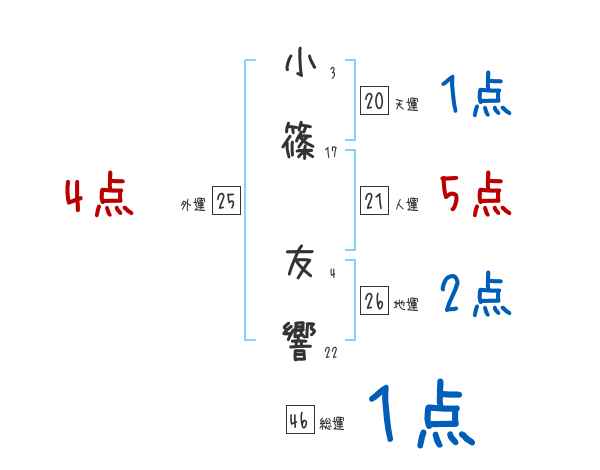 総運![]() | 小篠友響さんの総運は46画の1つ星!迷走することが多く苦労するかも。目先のことにとらわれないように。 あなたの人生を表す1番重要な運勢です。生涯を通じて影響する総合運となり、主に50歳以降の晩年期に影響を及ぼします。 |