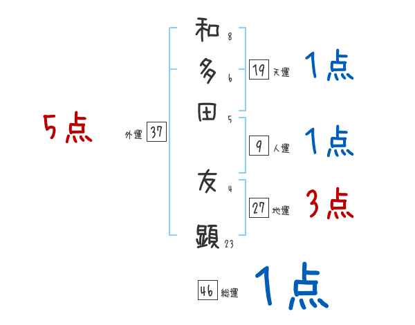 総運![]() | 和多田友顕さんの総運は46画の1つ星!迷走することが多く苦労するかも。目先のことにとらわれないように。 あなたの人生を表す1番重要な運勢です。生涯を通じて影響する総合運となり、主に50歳以降の晩年期に影響を及ぼします。 |