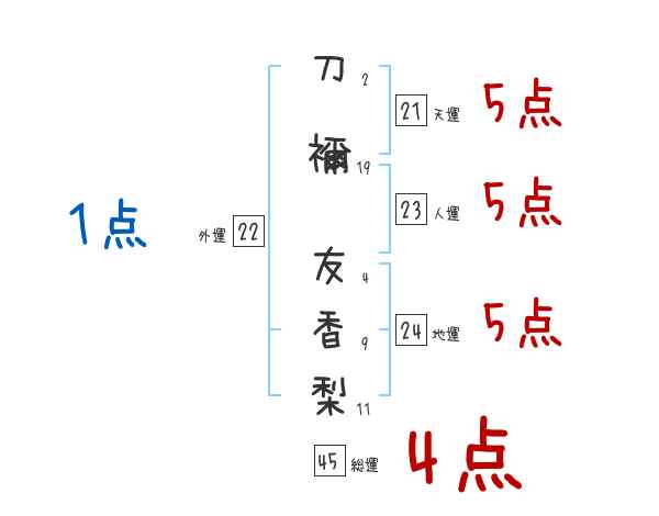 天運![]() | 刀禰友香梨さんの天運は21画の5つ星!統率力がある。独立し成功する。名誉を手に入れる。 家系が持つ宿命的な運勢を表します。祖先から受け継いだ苗字ですので自分の力が及びません。家柄を象徴します。 |