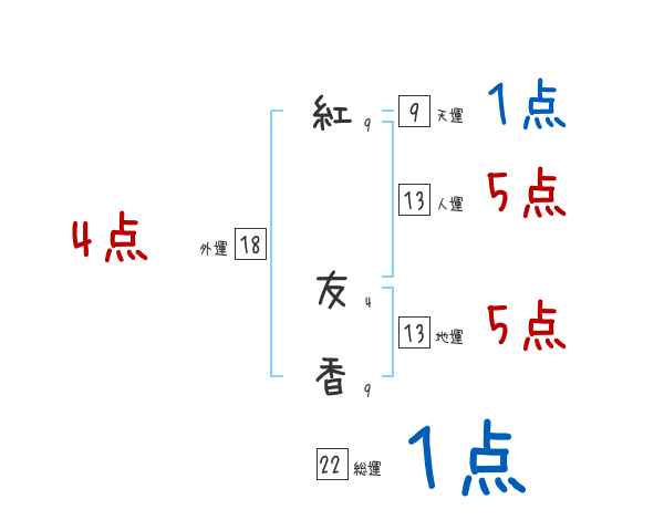 天運![]() | 紅友香さんの天運は9画の1つ星!消極的で才能を発揮することが苦手なことも。周りの意見に耳を傾けましょう。 家系が持つ宿命的な運勢を表します。祖先から受け継いだ苗字ですので自分の力が及びません。家柄を象徴します。 |