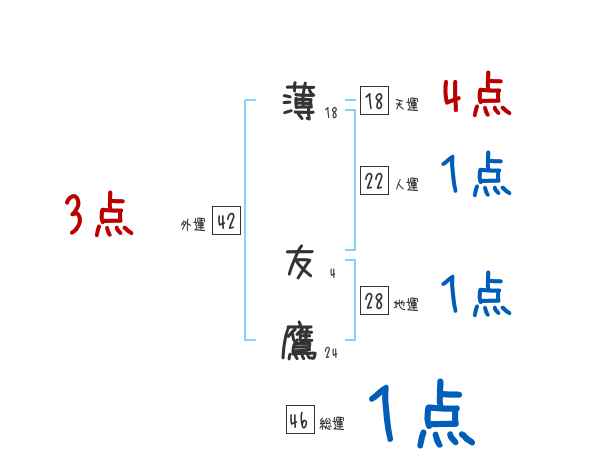 天運![]() | 薄友鷹さんの天運は18画の4つ星!情熱的で剛気。忍耐力があり信頼される。 家系が持つ宿命的な運勢を表します。祖先から受け継いだ苗字ですので自分の力が及びません。家柄を象徴します。 |