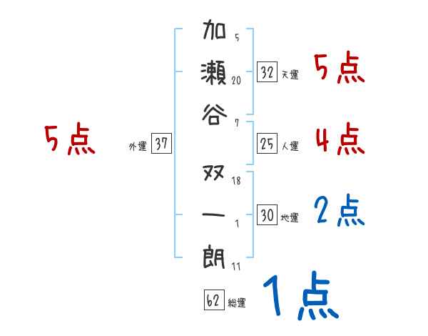 天運![]() | 加瀬谷双一朗さんの天運は32画の5つ星!柔軟性があり成功する。チャンスが多く金運が良い。 家系が持つ宿命的な運勢を表します。祖先から受け継いだ苗字ですので自分の力が及びません。家柄を象徴します。 |