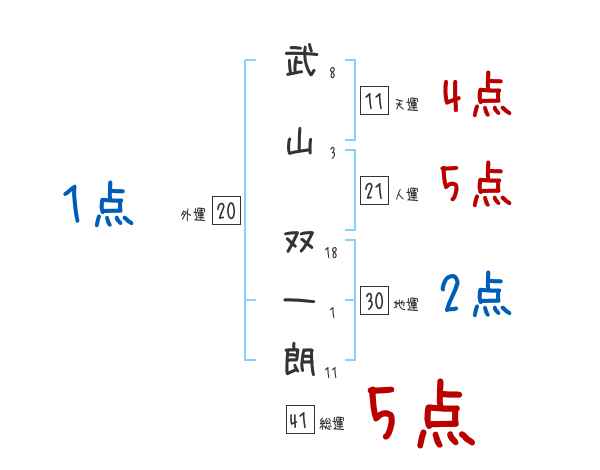 天運![]() | 武山双一朗さんの天運は11画の4つ星!着実に富や地位を得る幸運な人生。 家系が持つ宿命的な運勢を表します。祖先から受け継いだ苗字ですので自分の力が及びません。家柄を象徴します。 |