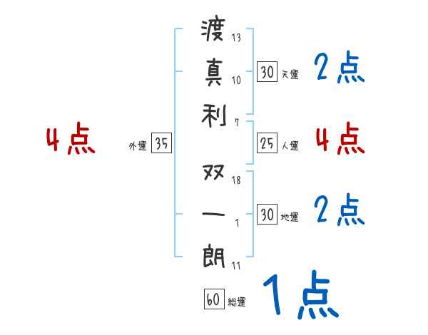 外運![]() | 渡真利双一朗さんの外運は35画の4つ星!温厚な性格で感受性が高い。穏和な性格で人望が厚い。 生活面を象徴する運勢です。外部から受ける影響力を表し、結婚運、家庭運や職場、環境への順応性を表します。 |