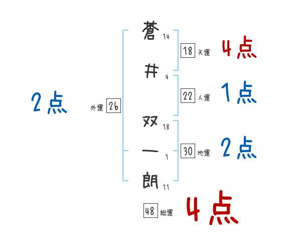 外運![]() | 蒼井双一朗さんの外運は26画の2つ星!波瀾万丈かも。信頼できる人を大事にしましょう。 生活面を象徴する運勢です。外部から受ける影響力を表し、結婚運、家庭運や職場、環境への順応性を表します。 |