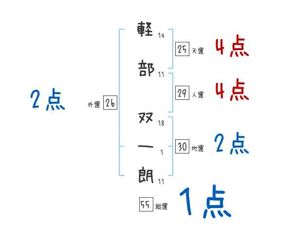 総運![]() | 軽部双一朗さんの総運は55画の1つ星!欲張りな性格で軽率な行動に注意しましょう。病気に気をつけて。 あなたの人生を表す1番重要な運勢です。生涯を通じて影響する総合運となり、主に50歳以降の晩年期に影響を及ぼします。 |