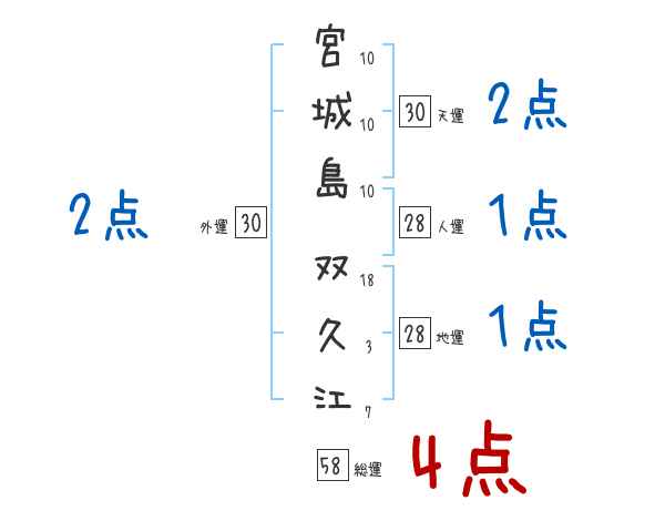 天運![]() | 宮城島双久江さんの天運は30画の2つ星!浮き沈みの激しさに注意しましょう。 家系が持つ宿命的な運勢を表します。祖先から受け継いだ苗字ですので自分の力が及びません。家柄を象徴します。 |