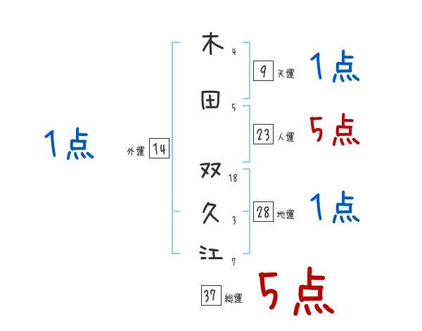 天運![]() | 木田双久江さんの天運は9画の1つ星!消極的で才能を発揮することが苦手なことも。周りの意見に耳を傾けましょう。 家系が持つ宿命的な運勢を表します。祖先から受け継いだ苗字ですので自分の力が及びません。家柄を象徴します。 |