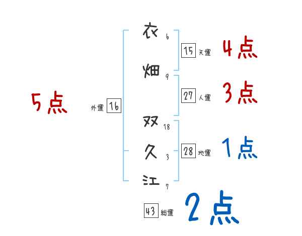 外運![]() | 衣畑双久江さんの外運は16画の5つ星!人望が厚く大きく発展する。逆転成功が見える。 生活面を象徴する運勢です。外部から受ける影響力を表し、結婚運、家庭運や職場、環境への順応性を表します。 |
