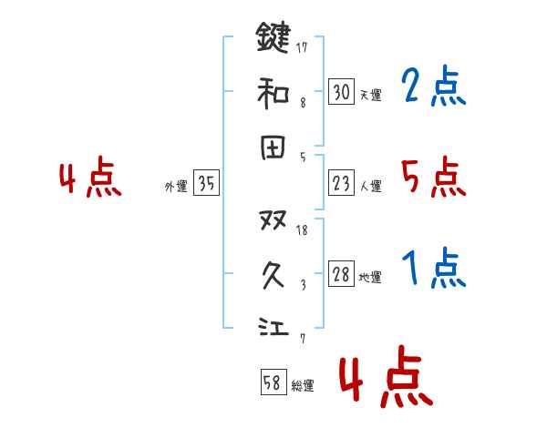 天運![]() | 鍵和田双久江さんの天運は30画の2つ星!浮き沈みの激しさに注意しましょう。 家系が持つ宿命的な運勢を表します。祖先から受け継いだ苗字ですので自分の力が及びません。家柄を象徴します。 |