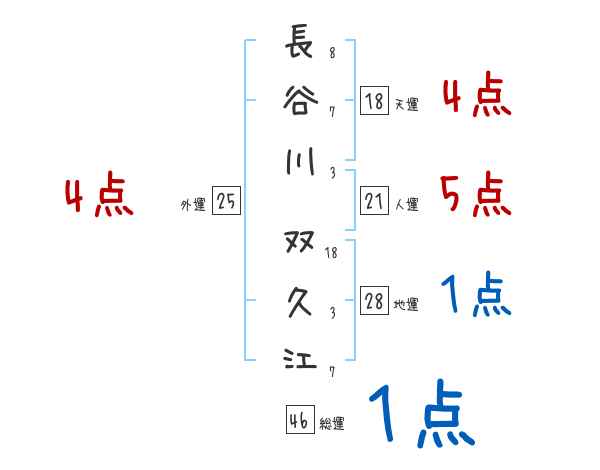 天運![]() | 長谷川双久江さんの天運は18画の4つ星!情熱的で剛気。忍耐力があり信頼される。 家系が持つ宿命的な運勢を表します。祖先から受け継いだ苗字ですので自分の力が及びません。家柄を象徴します。 |