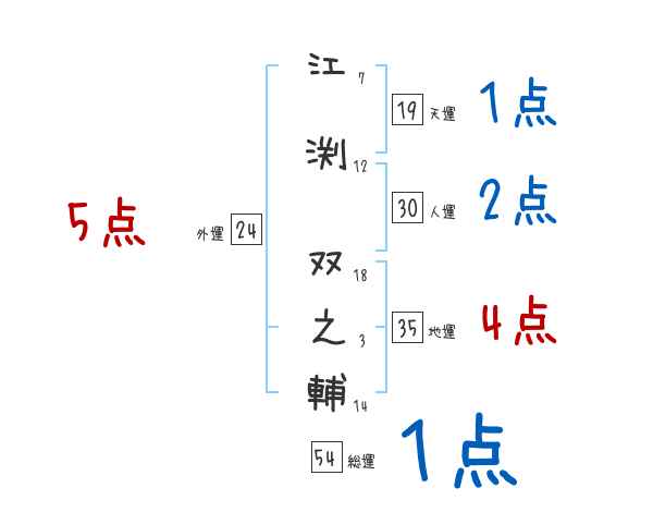 外運![]() | 江渕双之輔さんの外運は24画の5つ星!家庭運が良く順調な人生。金運にも恵まれる。 生活面を象徴する運勢です。外部から受ける影響力を表し、結婚運、家庭運や職場、環境への順応性を表します。 |