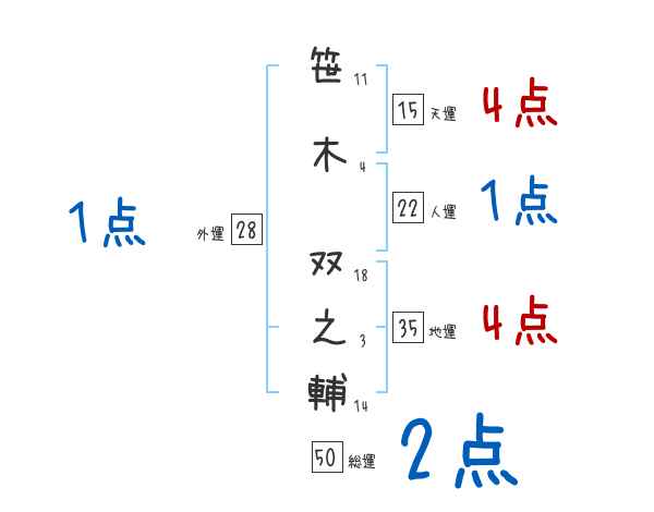天運![]() | 笹木双之輔さんの天運は15画の4つ星!人徳があり出世する。順調に物事を進め円満な人生。 家系が持つ宿命的な運勢を表します。祖先から受け継いだ苗字ですので自分の力が及びません。家柄を象徴します。 |