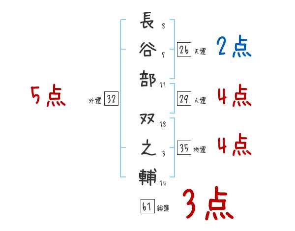 外運![]() | 長谷部双之輔さんの外運は32画の5つ星!柔軟性があり成功する。チャンスが多く金運が良い。 生活面を象徴する運勢です。外部から受ける影響力を表し、結婚運、家庭運や職場、環境への順応性を表します。 |