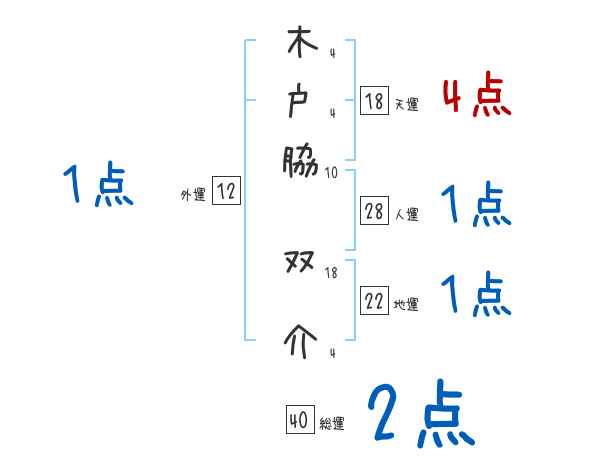 天運![]() | 木戸脇双介さんの天運は18画の4つ星!情熱的で剛気。忍耐力があり信頼される。 家系が持つ宿命的な運勢を表します。祖先から受け継いだ苗字ですので自分の力が及びません。家柄を象徴します。 |