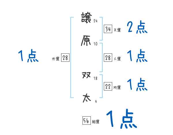 外運![]() | 譲原双太さんの外運は28画の1つ星!家庭環境に注意。スポーツで活躍できる能力があるかも。 生活面を象徴する運勢です。外部から受ける影響力を表し、結婚運、家庭運や職場、環境への順応性を表します。 |
