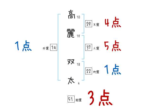 総運![]() | 高麗双太さんの総運は51画の3つ星!変化が激しく、危険に注意。堅実な性格。 あなたの人生を表す1番重要な運勢です。生涯を通じて影響する総合運となり、主に50歳以降の晩年期に影響を及ぼします。 |