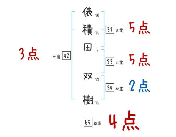 外運![]() | 俵積田双樹さんの外運は42画の3つ星!病気に注意。多芸であるが消極的でおとなしい。 生活面を象徴する運勢です。外部から受ける影響力を表し、結婚運、家庭運や職場、環境への順応性を表します。 |