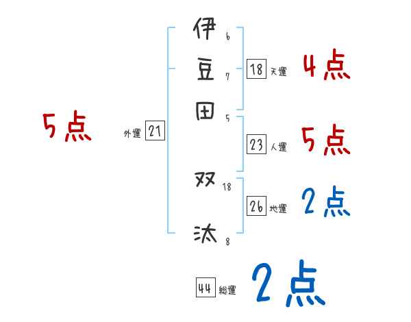 総運![]() | 伊豆田双汰さんの総運は44画の2つ星!誠実で慎重な性格。物事を考えすぎないように注意しましょう。 あなたの人生を表す1番重要な運勢です。生涯を通じて影響する総合運となり、主に50歳以降の晩年期に影響を及ぼします。 |