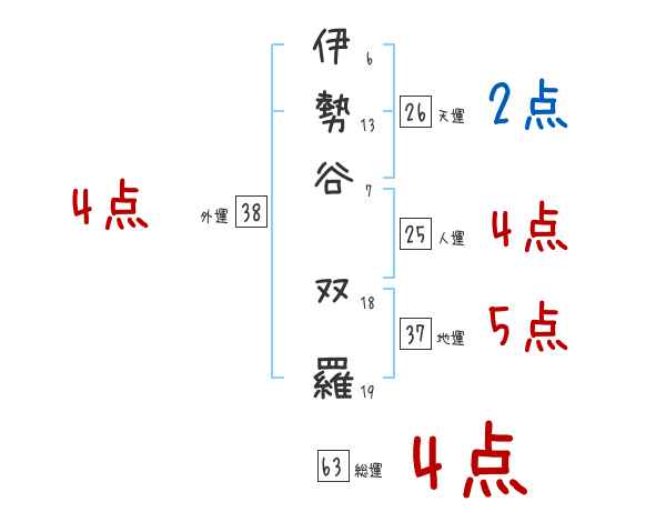 天運![]() | 伊勢谷双羅さんの天運は26画の2つ星!波瀾万丈かも。信頼できる人を大事にしましょう。 家系が持つ宿命的な運勢を表します。祖先から受け継いだ苗字ですので自分の力が及びません。家柄を象徴します。 |