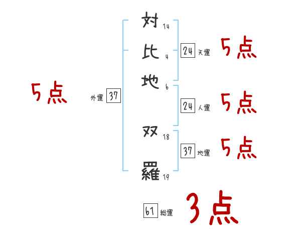 外運![]() | 対比地双羅さんの外運は37画の5つ星!努力家で順応性に優れる。現実的な考え方ができ忠実に物事をこなす。 生活面を象徴する運勢です。外部から受ける影響力を表し、結婚運、家庭運や職場、環境への順応性を表します。 |