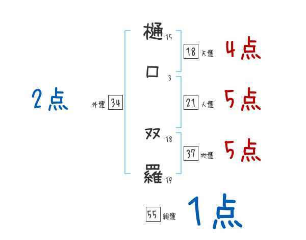 天運![]() | 樋口双羅さんの天運は18画の4つ星!情熱的で剛気。忍耐力があり信頼される。 家系が持つ宿命的な運勢を表します。祖先から受け継いだ苗字ですので自分の力が及びません。家柄を象徴します。 |