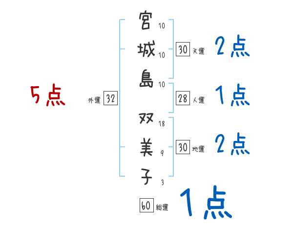 外運![]() | 宮城島双美子さんの外運は32画の5つ星!柔軟性があり成功する。チャンスが多く金運が良い。 生活面を象徴する運勢です。外部から受ける影響力を表し、結婚運、家庭運や職場、環境への順応性を表します。 |