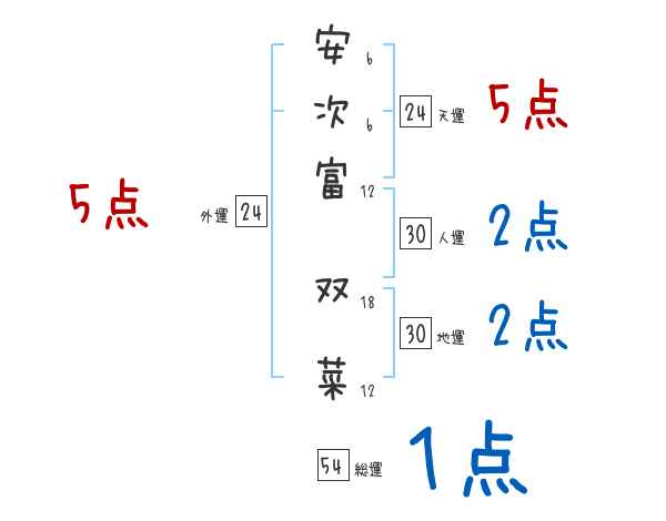 外運![]() | 安次富双菜さんの外運は24画の5つ星!家庭運が良く順調な人生。金運にも恵まれる。 生活面を象徴する運勢です。外部から受ける影響力を表し、結婚運、家庭運や職場、環境への順応性を表します。 |
